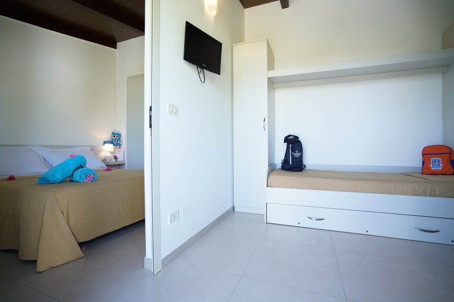 Camera Family da 2 a 4 posti letto, composte da soggiorno con divano letto doppio estraibile o a castello e camera matrimoniale, split aria condizionata in camera, TV in soggiorno.