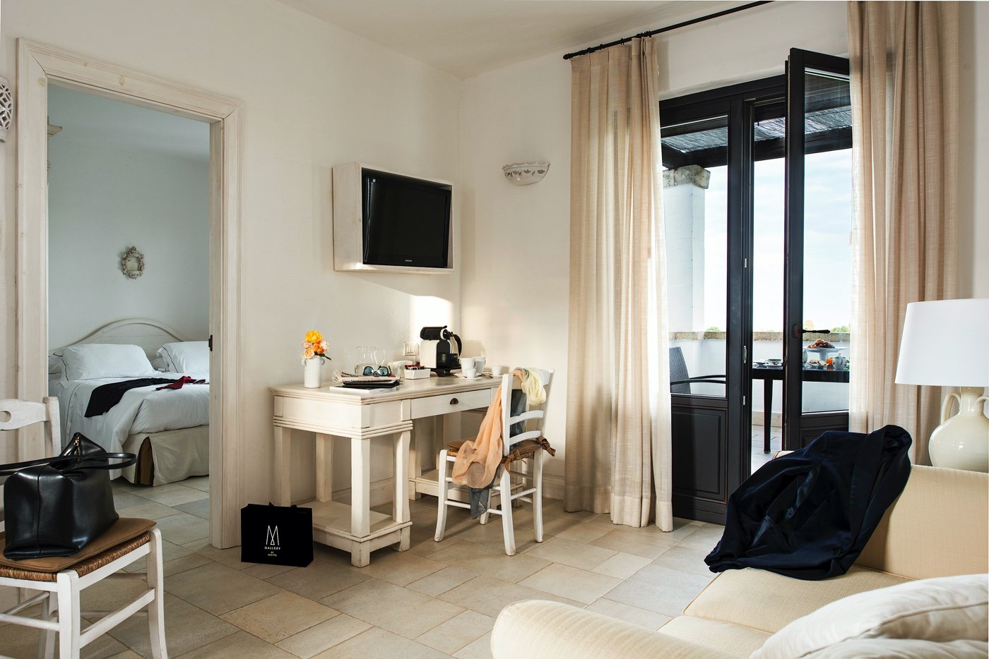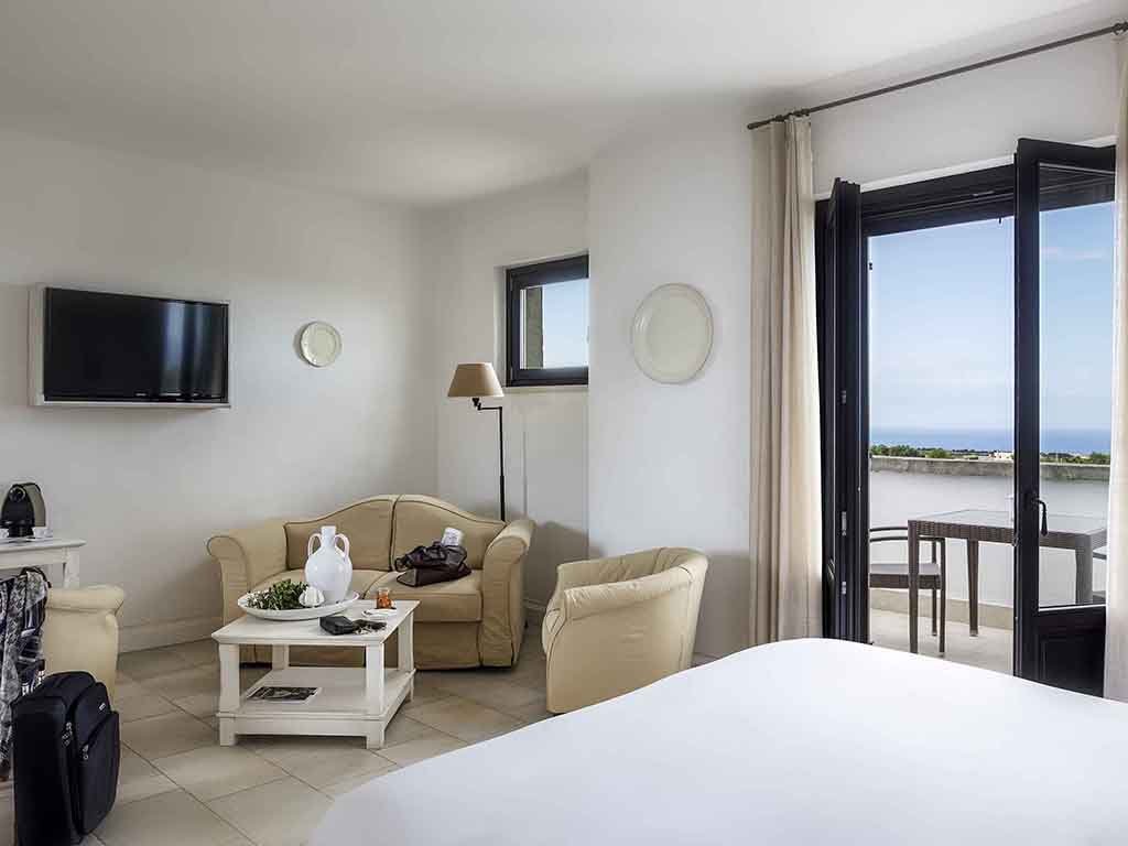 Prestigiose camere e raffinate suite vi accoglieranno con arredamenti essenziali, affacciandosi lì, dove i colori della terra si fondono con l'azzurro del cielo e del mare, avvolti dall'estasi dei profumi mediterranei.