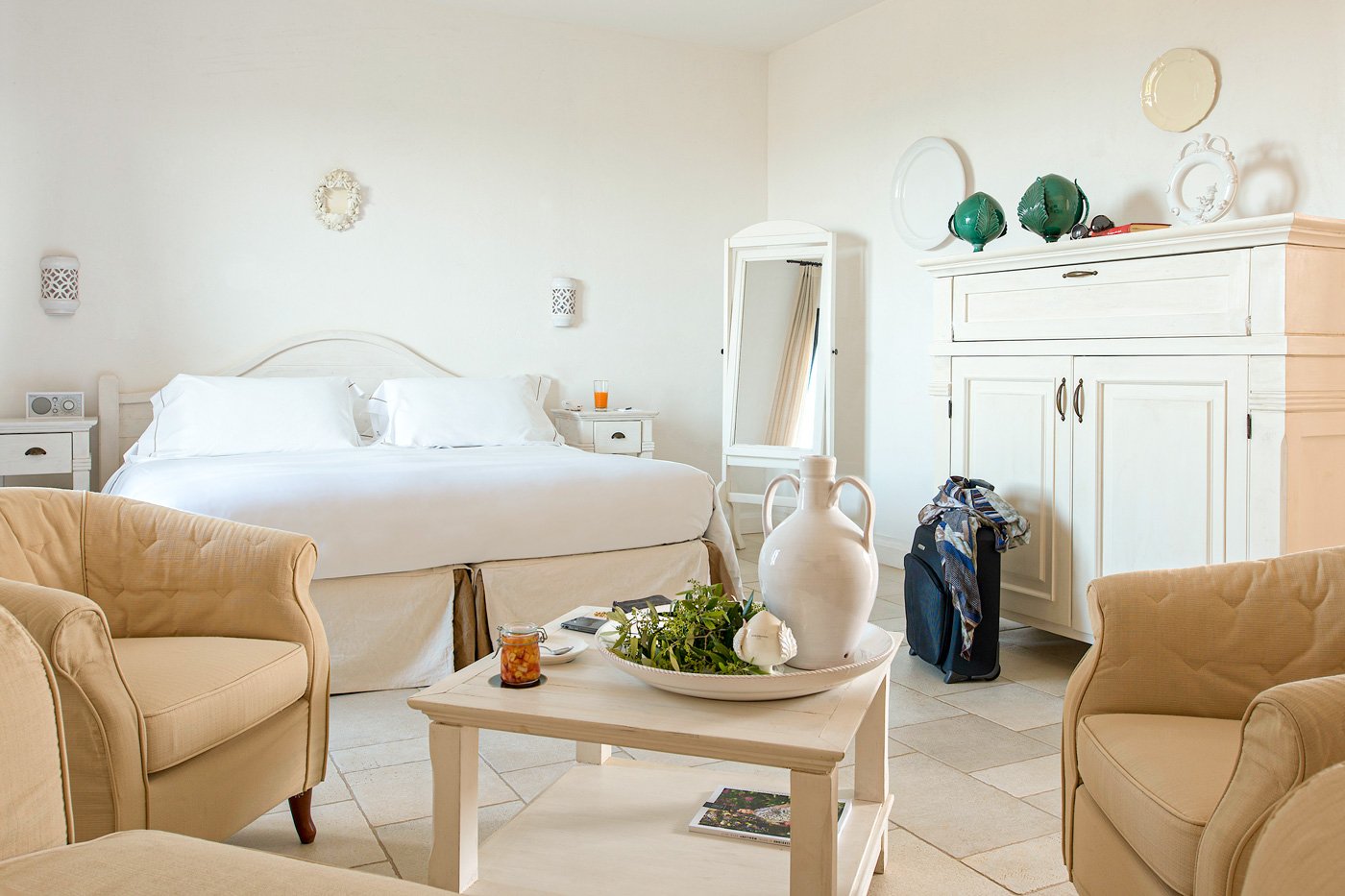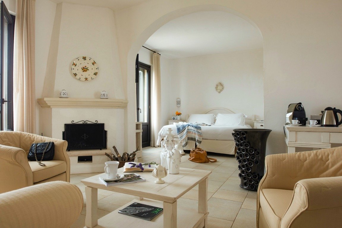 Le camere Suite sono impreziosite da un grazioso terrazzino o da un patio privato ed offrono una vista incantevole sulla piscina, sulla campagna circostante o sul Mar Adriatico. Sono arredate seguendo il gusto e lo stile tipico di una antica masseria pugliese e constano di camera da letto, salotto e bagno.