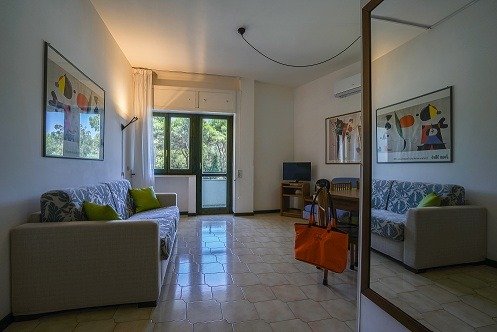 Gli appartamenti sono dislocati in 2 palazzine a 3 piani servite da ascensore e dotati di bagni con doccia e scaldabagno elettrico, angolo cottura con piastre elettriche, TV LCD, aria condizionata, balcone attrezzato con tavolo e sedie con vista sulla pineta e distano dal mare dai 350 (corpo centrale) ai 600 mt. circa. Sono disponibili nelle seguenti tipologie: Monolocale 2-4: proposto esclusivamente in formula Aparthotel, è composto da una camera con letto matrimoniale, una o due poltrone letto e angolo cottura (non incluso nel servizio). Situati nel corpo centrale della struttura sono stati tutti rinnovati nel 2015. Bilocale 2-5: composto da soggiorno con angolo cottura e divano letto matrimoniale, poltrona letto e camera matrimoniale. Trilocale 6 tipo : composto da soggiorno con angolo cottura e divano letto matrimoniale, camera matrimoniale, cameretta con letto a castello. Trilocale 6 tipo D: realizzato su due livelli, ospitante nella zona giorno il soggiorno con angolo cottura e divano letto matrimoniale e servizi. Nella zona notte, posta al piano superiore, è presente una camera matrimoniale con servizi indipendenti e una cameretta con letto a castello.
