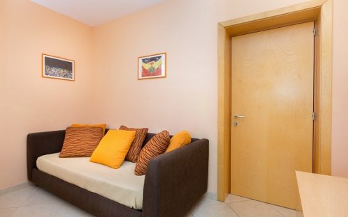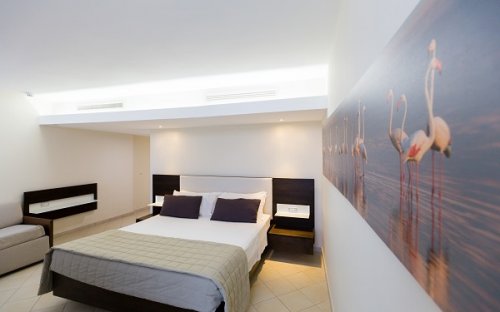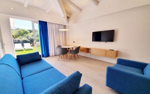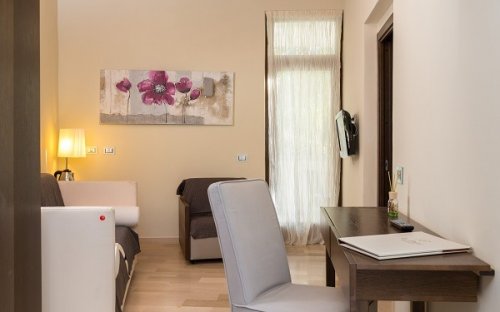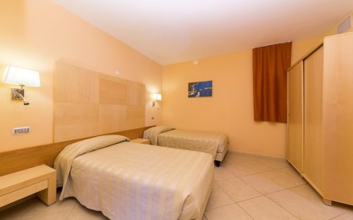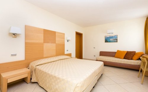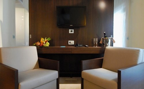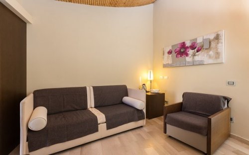 Family suite (max 5 persone) 40 mq: Tutte di design moderno, curatissime in ogni dettaglio sono composte da due ambienti, soggiorno e camera da letto. Tutte le family suite dispongono di doppi servizi con vasca e doccia, di patio o terrazzino attrezzato ed offrono climatizzatore, ciabattine, mini-frigo, phon, set di cortesia, tv satellitare LCD, servizi con doccia, telefono diretto, connessione wi- fi e cassaforte.