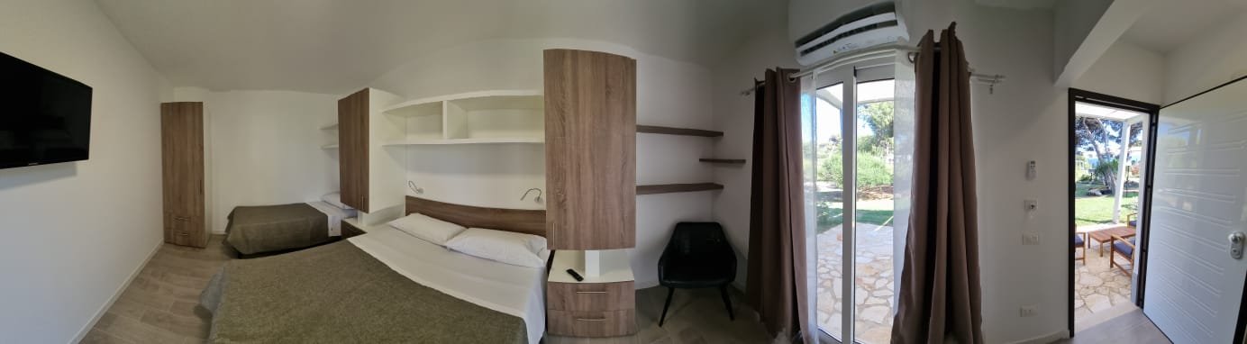 Camera tripla in stile mediterraneo, dispongono di servizi con asciugacapelli, telefono, aria condizionata, minifrigo, televisore, patio se al piano terra, terrazzino se al primo piano, bagno con box doccia rinnovato in tutte le camere.