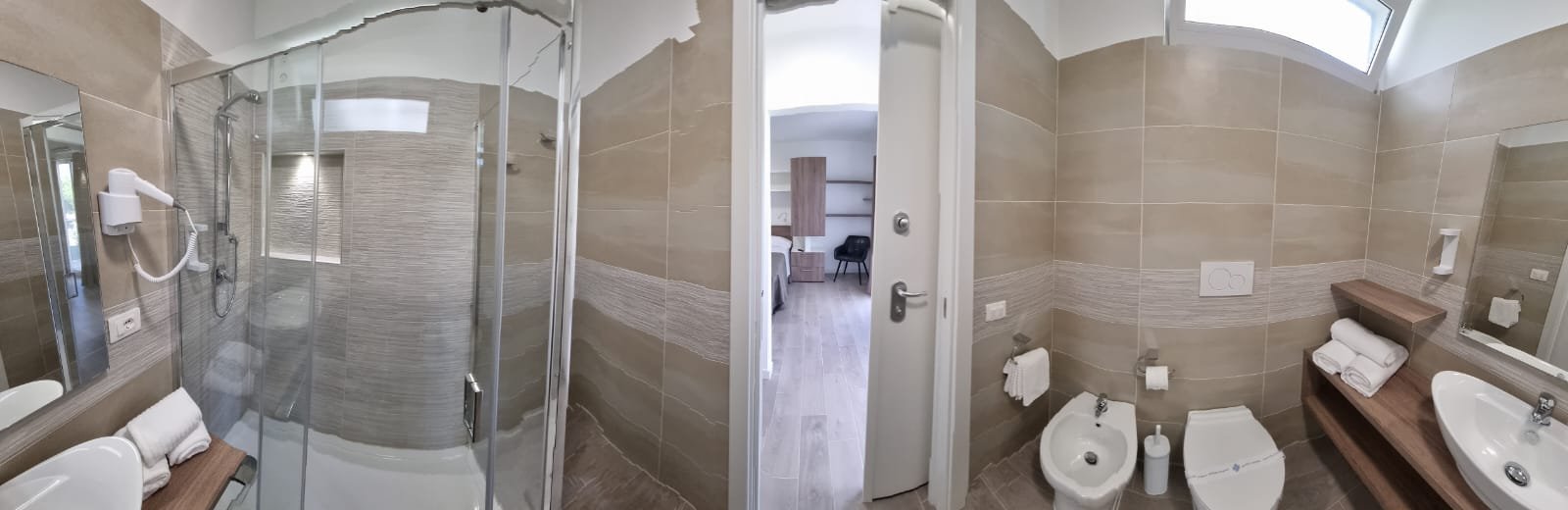Camera matrimoniale o doppia in stile mediterraneo, dispongono di servizi con asciugacapelli, telefono, aria condizionata, minifrigo, televisore, patio se al piano terra solo con porta-finestra, terrazzino se al primo piano, bagno con box doccia rinnovato in tutte le camere.