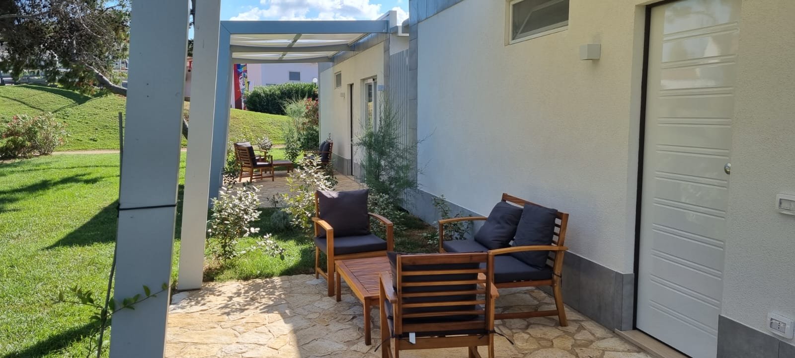 Per 3 occupanti minimo 2.5 quote paganti. : La villetta è composta da una camera da letto con letto matrimoniale e letto singolo, bagno finestrato con ampia doccia, ampio patio esterno attrezzato con divanetto, tavolino e due poltroncine, tv schermo piatto, mini frigo, aria condizionata, nuoca costruzione ecosostenibile a piano terra.