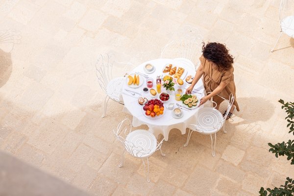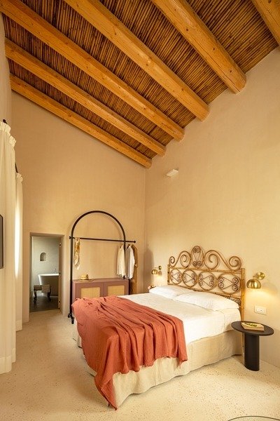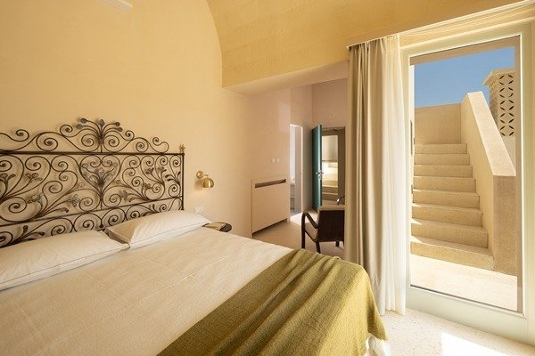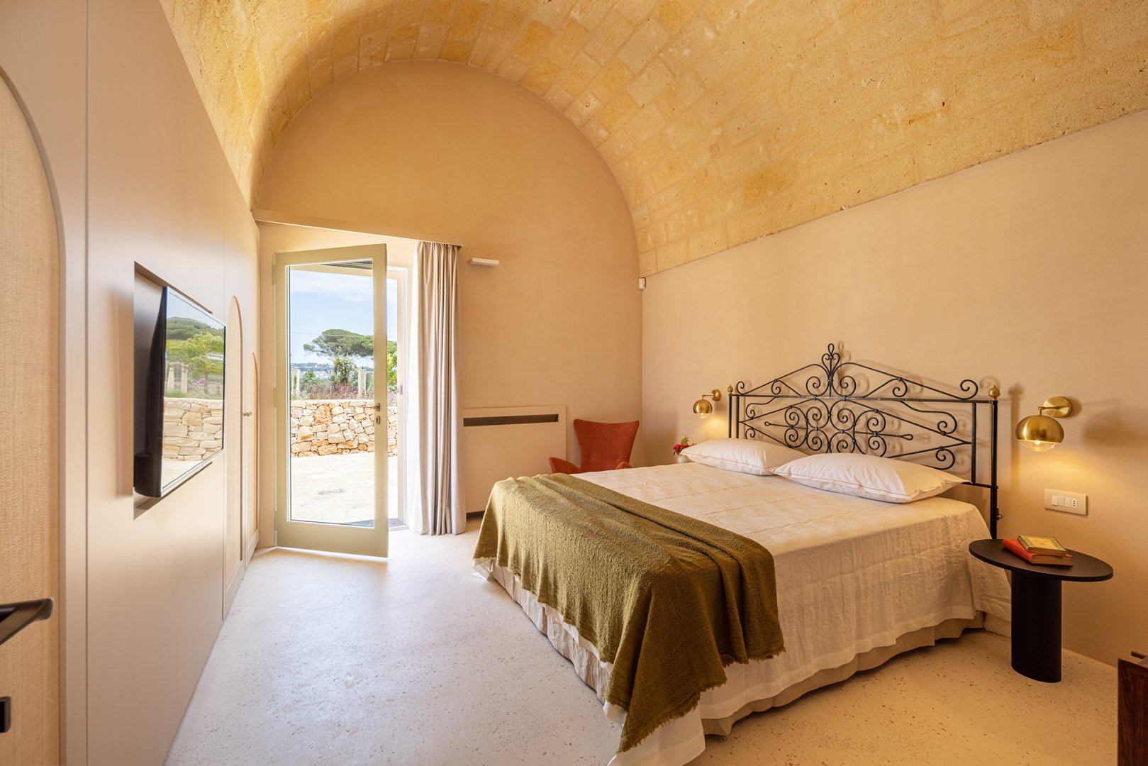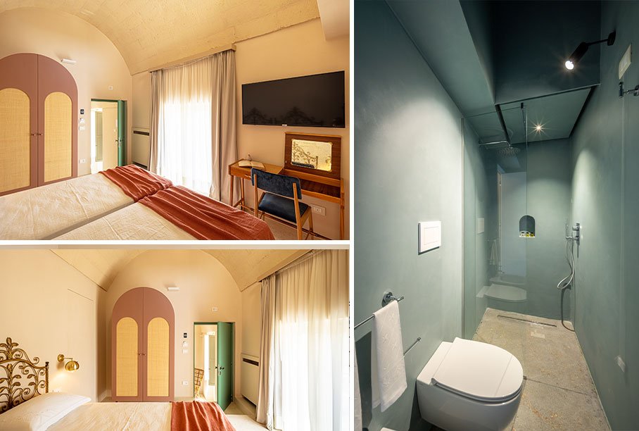 Camera: Le 6 camere e suite, dotate di vista sulle corti o sul verde circostante, sono caratterizzate da una palette di colori soft e disponogono tutte di connessione WIFI, TV a scherma piatto, morbida biancheria da bagno in cotone organico e prodotti Essentia Puglia. Le tre suite vantano ampie terrazze da cui ammirare la campagna e i suoi affascinanti colori nelle diverse ore della giornata.