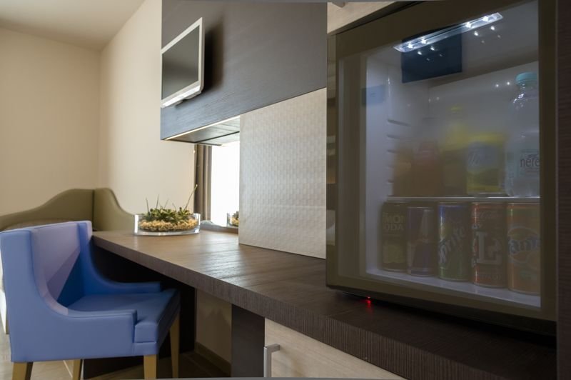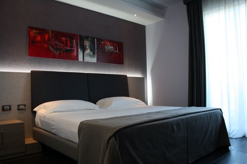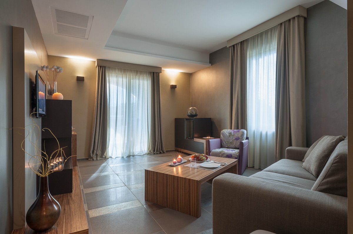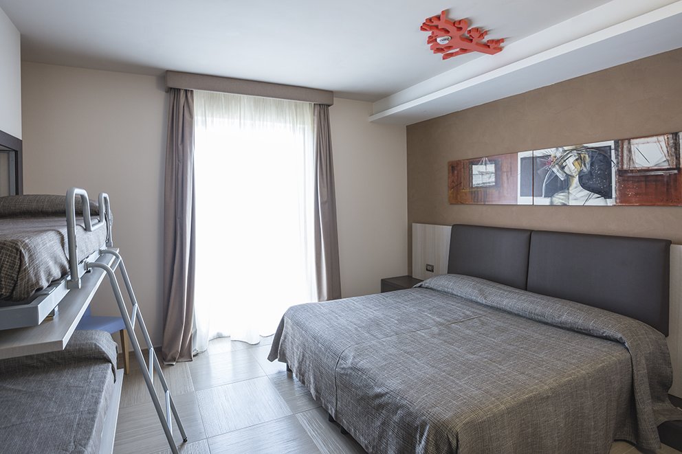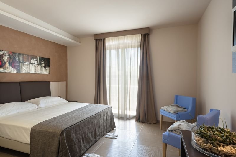 Le 47 Camere sobrie ed eleganti, con balconcino, tra Superior (24 mq) vista interna o esterna sul paesaggio circostante, Deluxe (30 mq) vista mare laterale, curata nei dettagli e Suite (50 mq) soggiorno con divano letto, camera matrimoniale, Jacuzzi, patio con vista interna o campagna. Quarto letto in Suite solo per bambini 4/12 anni. Camere per disabili in Superior e Deluxe. Tutte le camere sono ddotate di doccia e phon, Wi-fi, telefono, TV- Sat con Sky, minifrigo, cassetta di sicurezza, aria condizionata. Riassetto camere da giugno a settmbre.