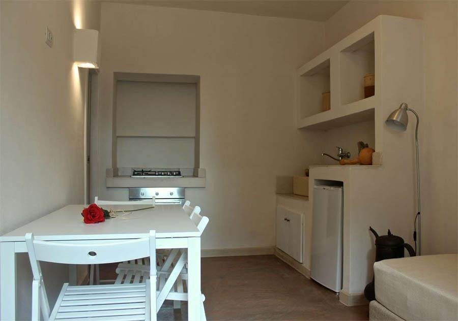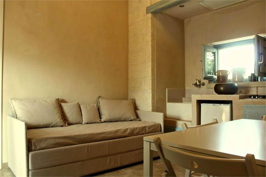 La Junior Suite (32 mq), ricavata da una vecchia casa colonica, è arredata completamente in pietra in stile contemporaneo, è indipendente dalla corpo principale della masseria ed è composto da camera dal letto matrimoniale e zona living con annessa cucina.