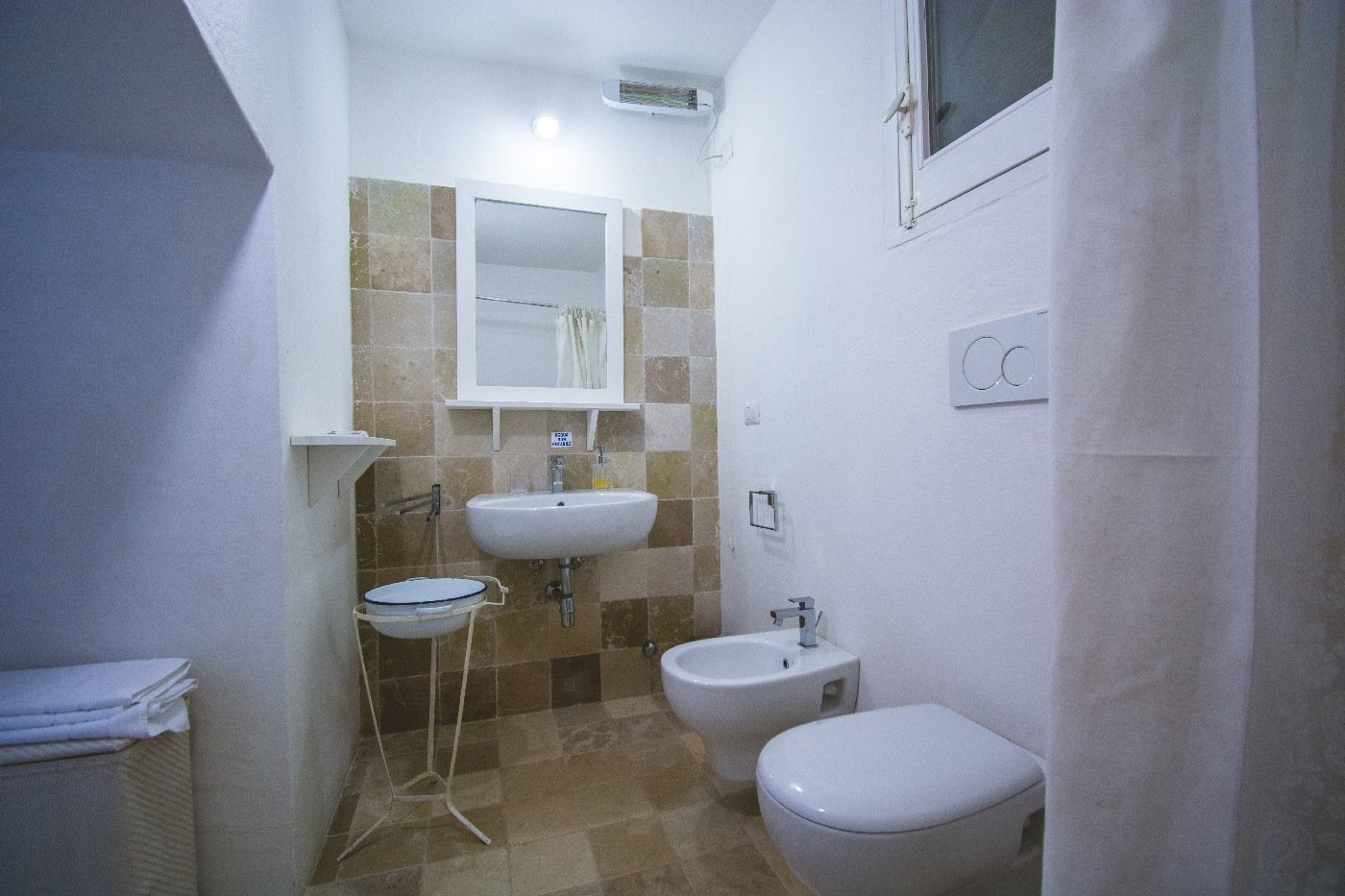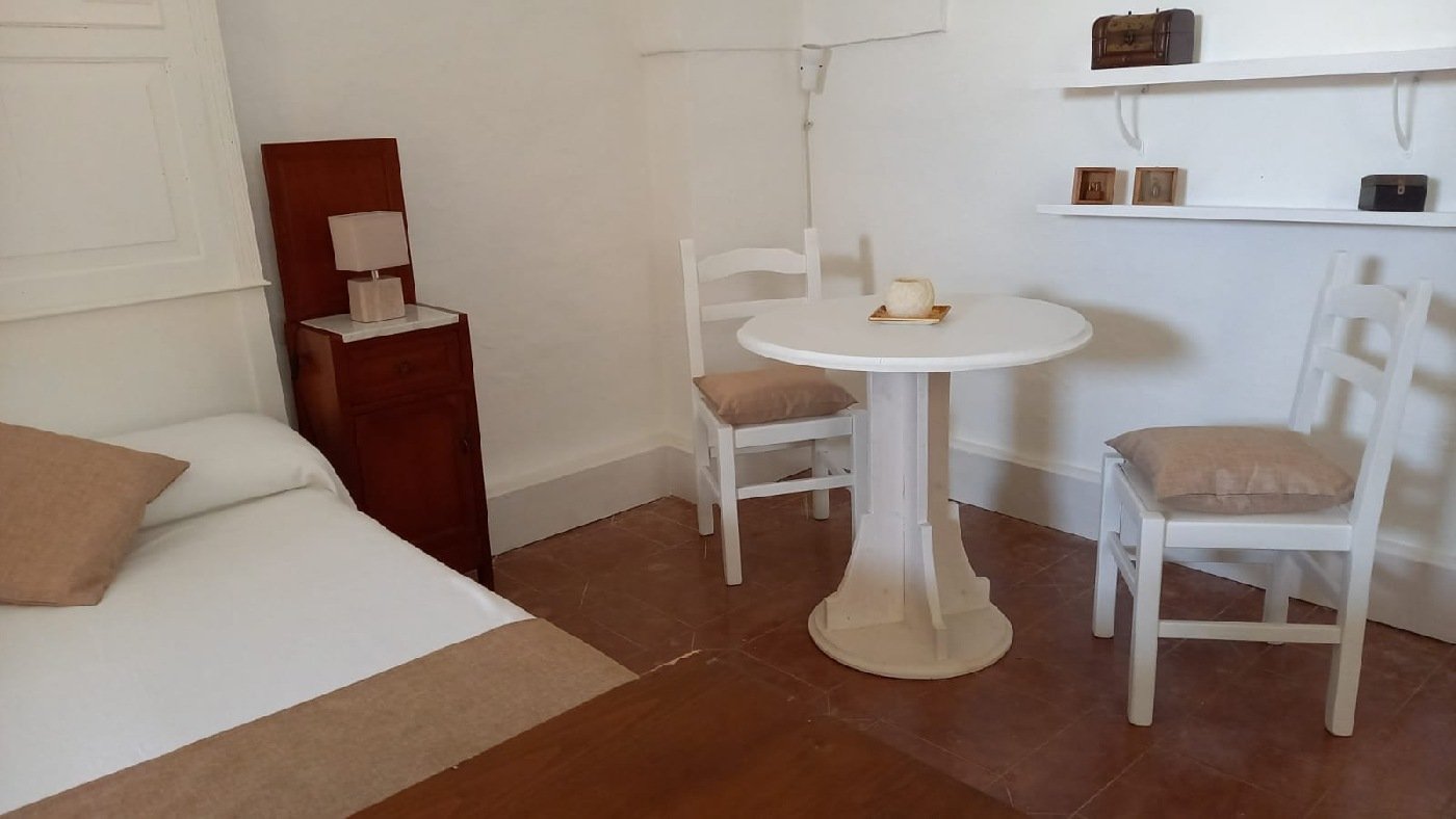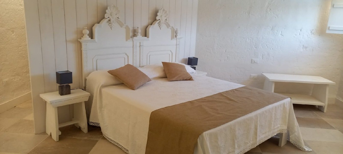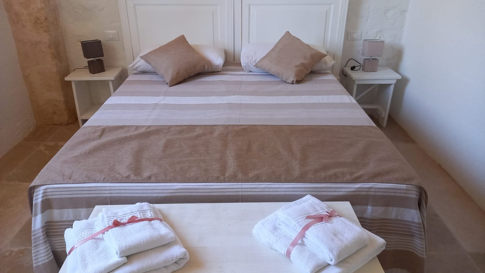 Ampia camera con WC, camino, terrazza panoramica vista mare al primo piano. Letto matrimoniale, possibilità terzo letto. La camera, le pareti, il camino, gli arredi sono legati alla tradizione delle masserie del Salento. Fino a 2+1 persone.