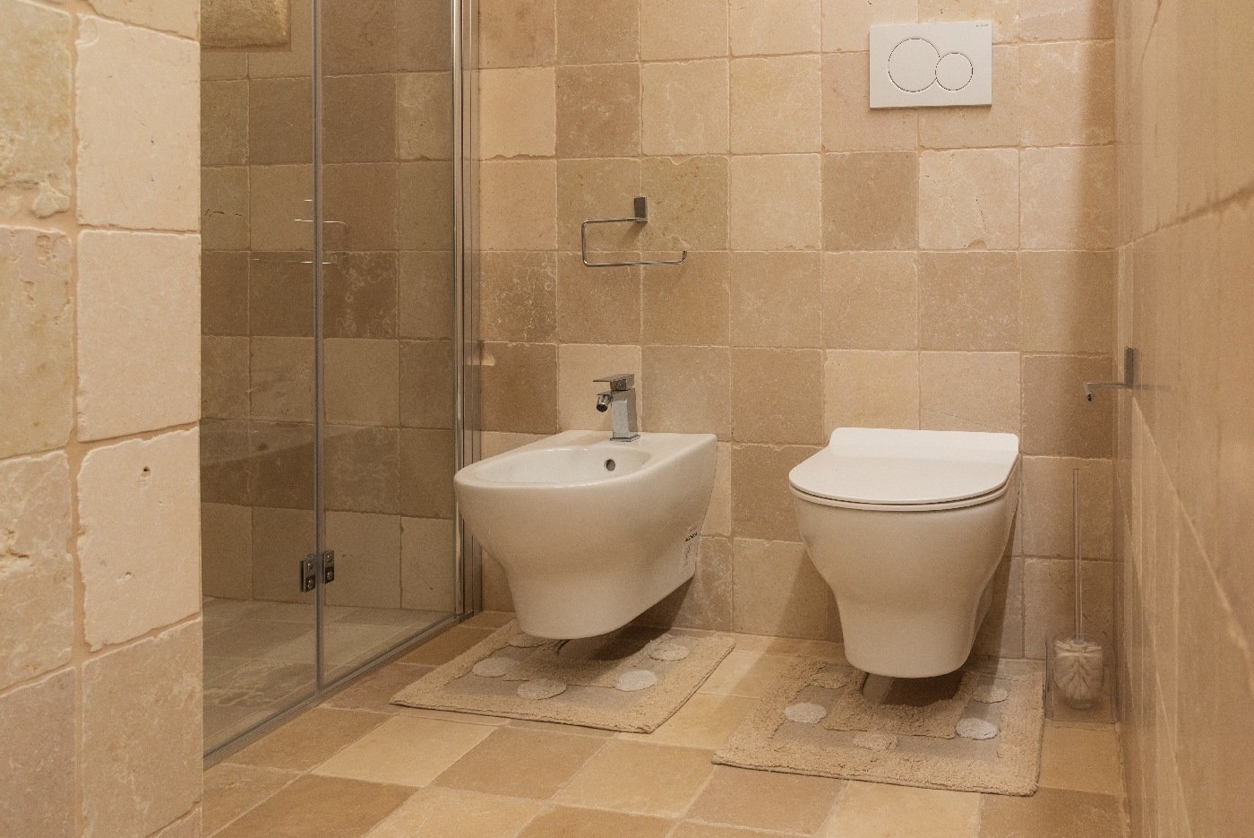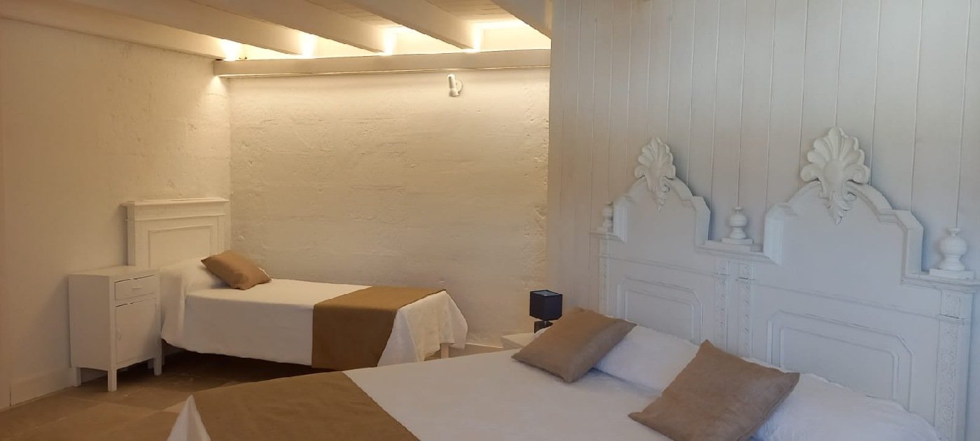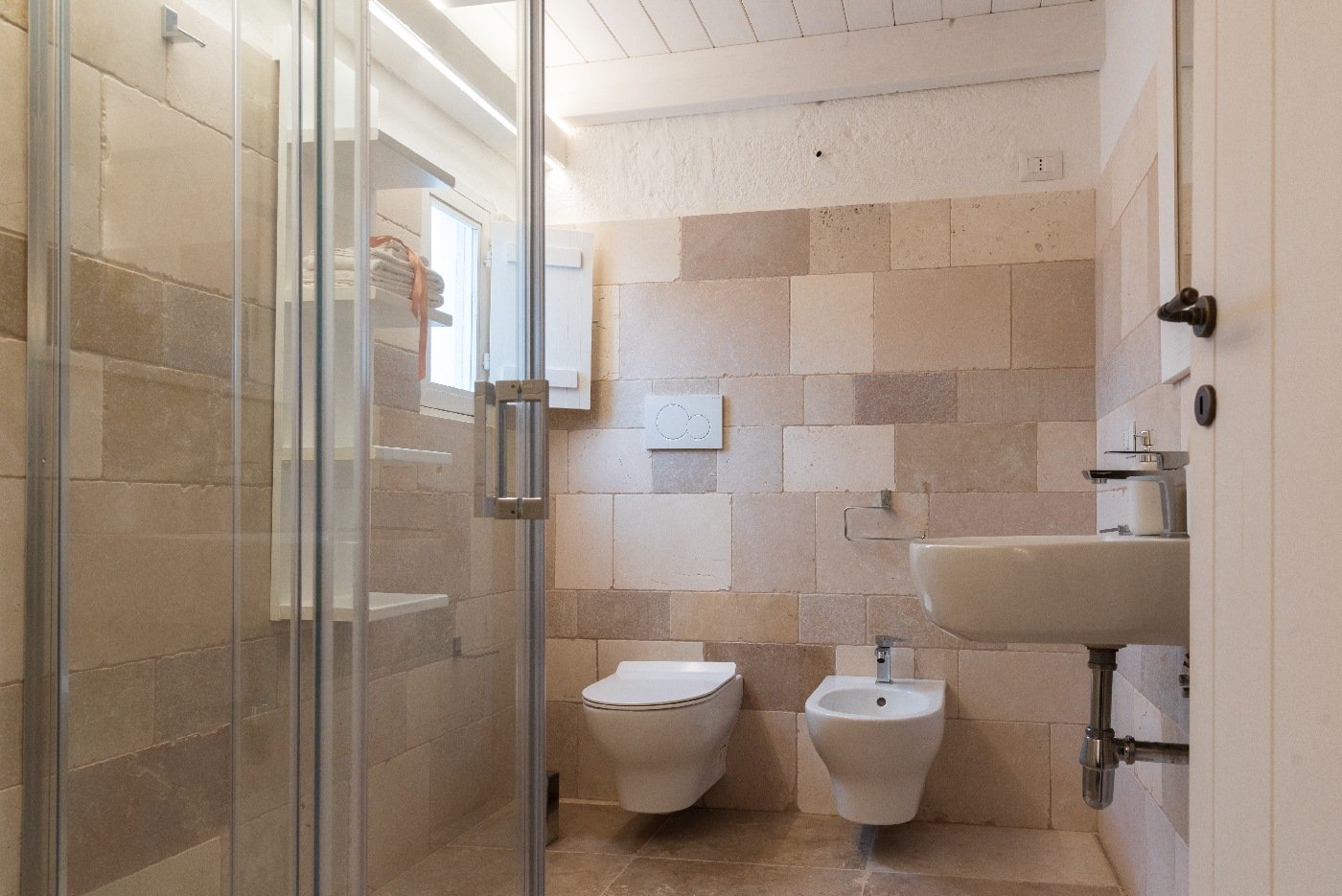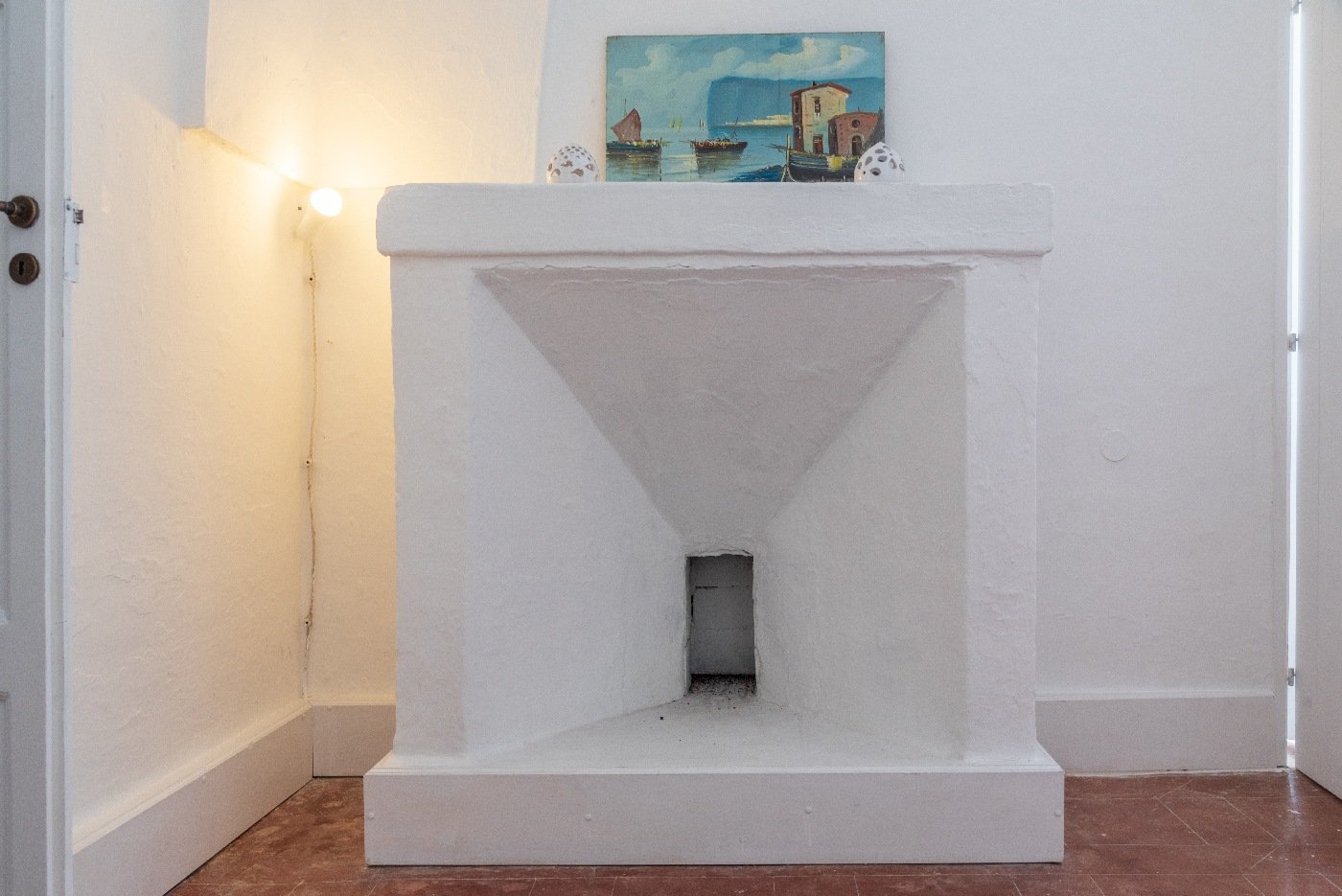 Ampia camera con WC, camino, terrazza panoramica vista mare al primo piano. Letto matrimoniale, possibilità terzo letto. La camera, le pareti, il camino, gli arredi sono legati alla tradizione delle masserie del Salento. Fino a 2+1 persone.