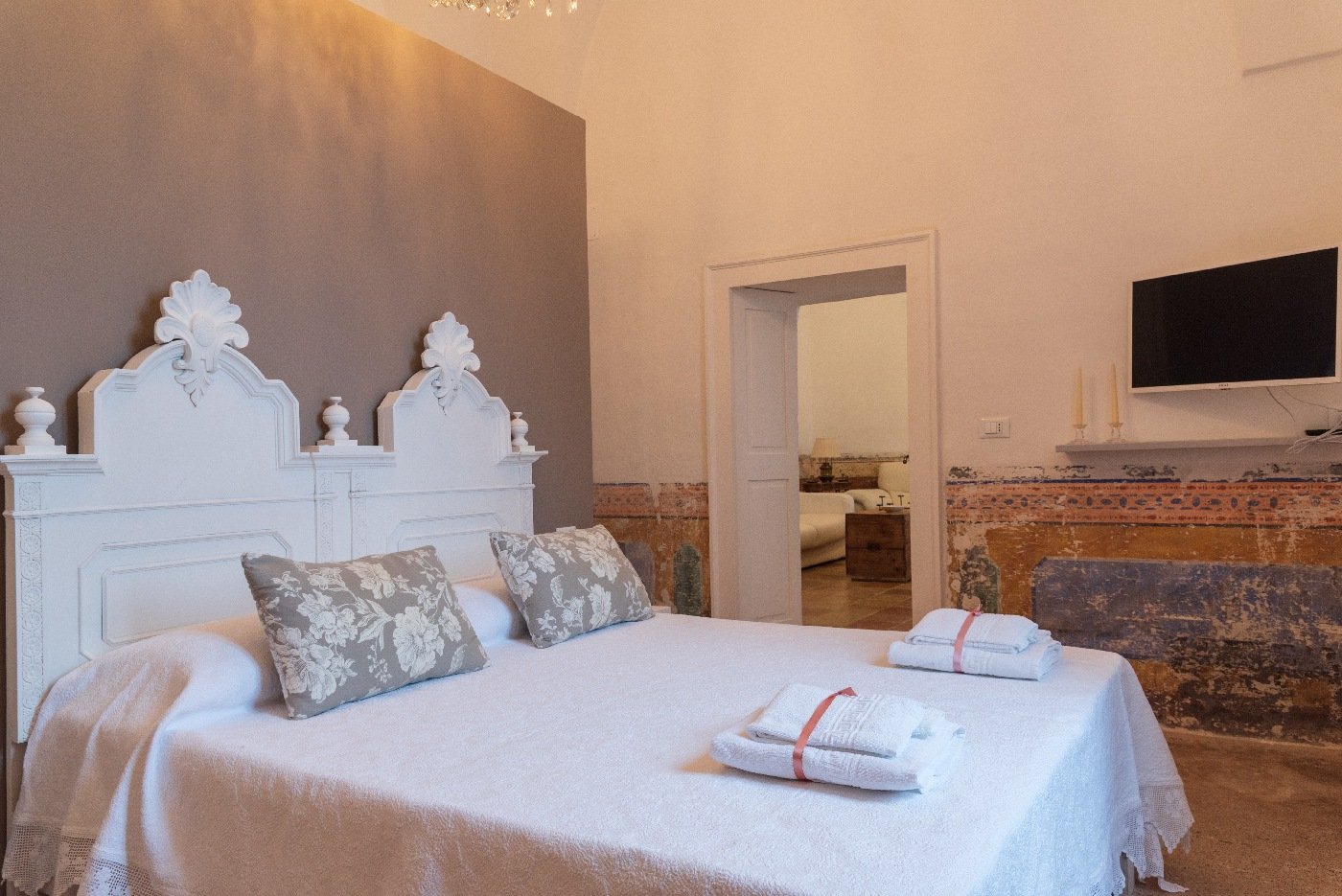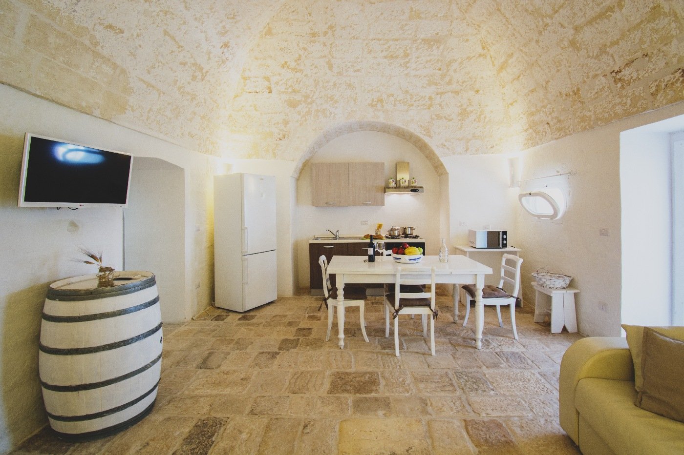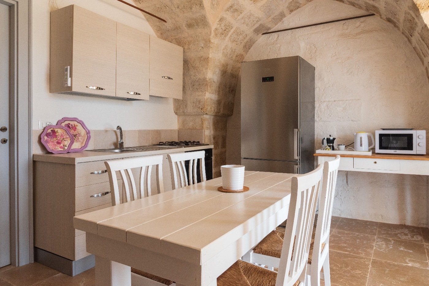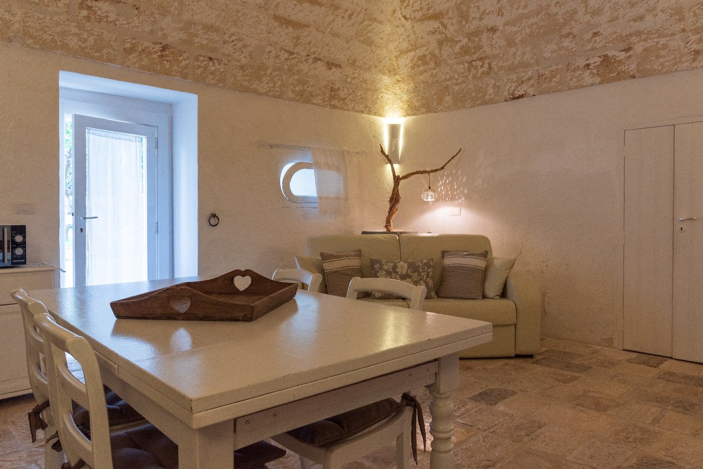 La struttura è caratterizzata da doppie volte in tufo, pavimenti in pietra originale dell’epoca, muri spessi fino a un metro, tipico delle abitazioni delle masserie salentine.
