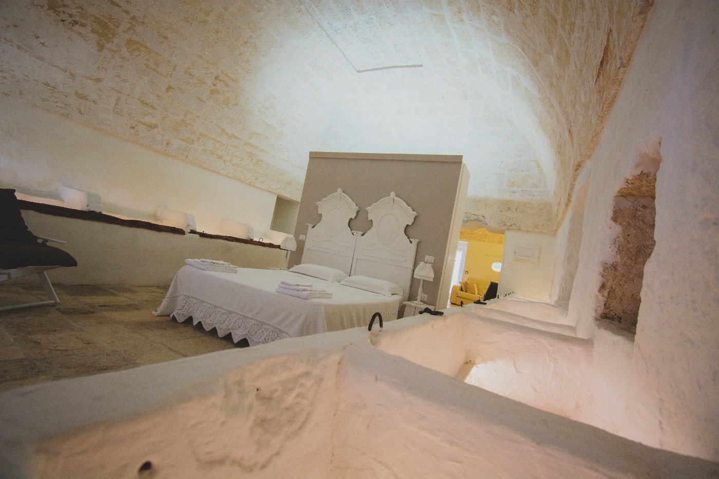 La Macchia: Ampia camera con WC, camino, terrazza panoramica vista mare al primo piano. Letto matrimoniale, possibilità terzo letto. La camera, le pareti, il camino, gli arredi sono legati alla tradizione delle masserie del Salento. Può ospitare fino a 2+1 persone.