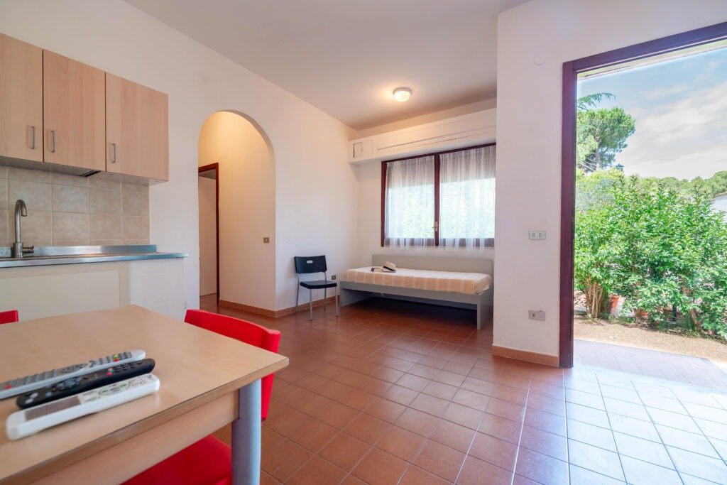 Villetta spaziosa con entrata indipendente e con giardino privato, immerso completamente nella pineta. E' dotato di angolo cottura, set di stoviglie, bicchieri e posate, frigorifero con congelatore, tv, aria condizionata e non prevede la moka per il caffè. Bagno con box doccia. Dotato di una camera matrimoniale, una cameretta con due lettini singoli per un maggiore comfort e un lettino nel soggiorno. Questo appartamento è ideale per le famiglie composte fino a un massimo di 6 persone. Leggi tutto »