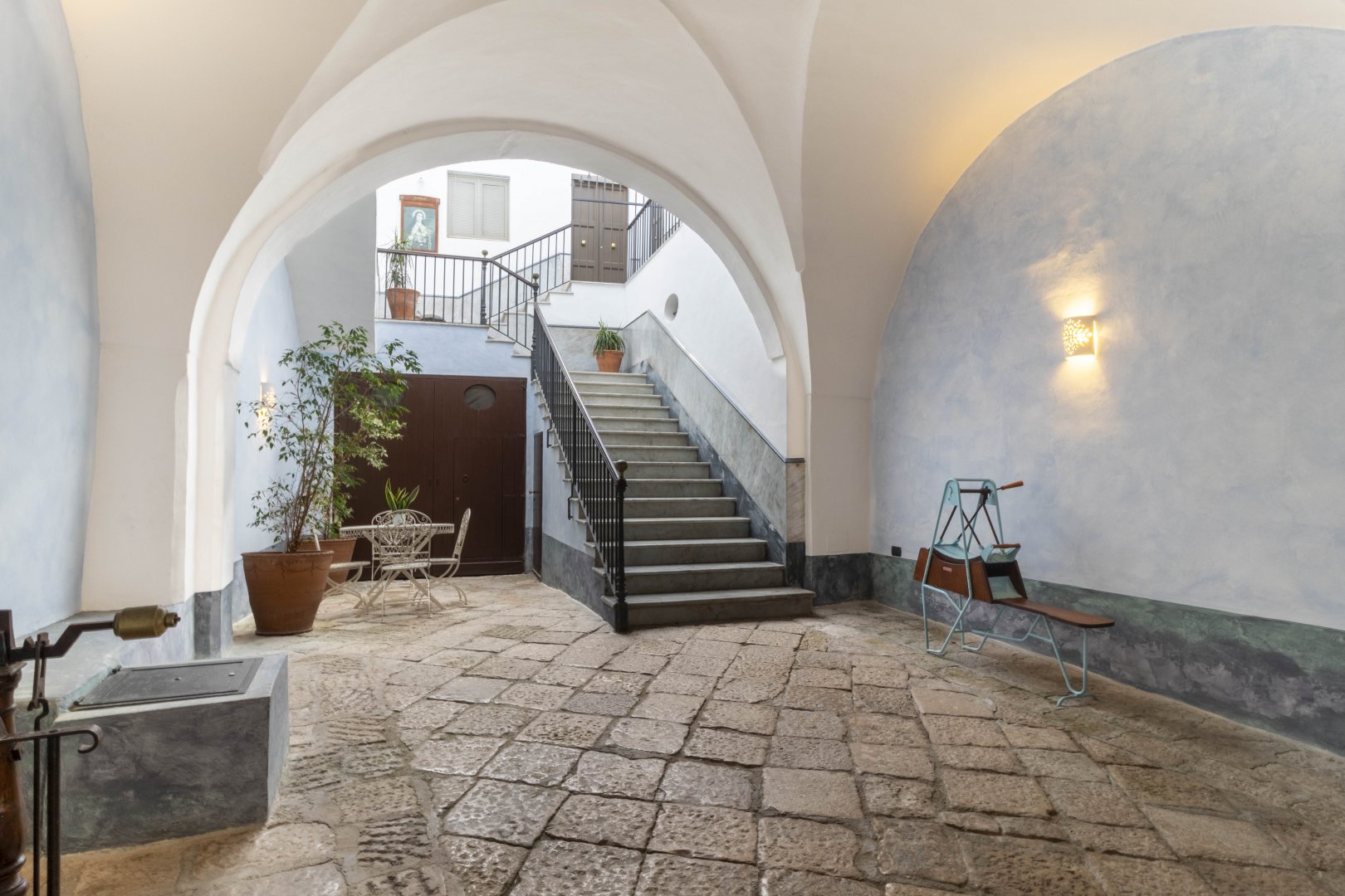 La camera, completa di ogni confort, è abbracciata dalle alte volte a stella, la cui imponenza non rinuncia alla dolce raffinatezza che è la cifra stilistica dell’intero ambiente. A decorare i suoi peculiari soffitti, infatti, sono affreschi che alternano al bianco le sfumature più tenui del verde e richiami floreali dalle linee sinuose e morbide, che si ritrovano negli arredi originali d’epoca in stile liberty. Le linee del letto matrimoniale in ferro battuto aggiungono morbidezza alle colorate geometrie del pavimento d’epoca, che omaggia i colori del mare e che fa da specchio alla luce mite e calda di questa stanza.