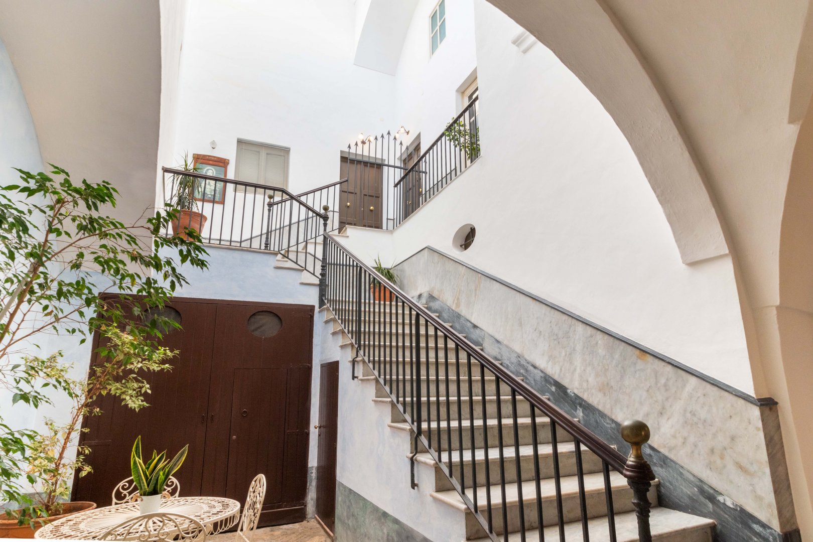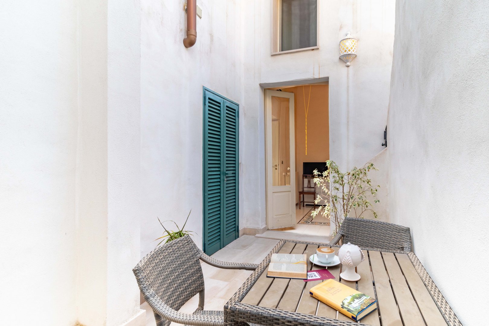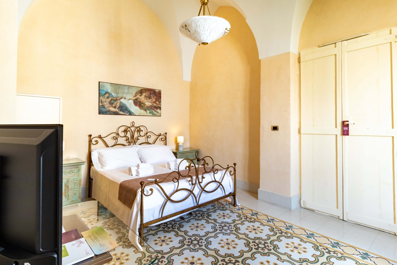 Junior Suite: Una perla delicata e ricolma di luce, resa raffinata da ogni dettaglio e rifinitura in stile liberty completa la proposta di camere del Palazzo. La Junior Suite, al piano rialzato, è il tesoro inaspettato tra le antiche volte del Settecento. Completa di ogni comfort, TV e connessione Wi-Fi, la Junior Suite dona spazio alle sfumature più tenui del rosa, da quelle che richiamano i fiori del mandorlo a quelle più intense, che punteggiano di vivacità i tanti riflessi del sole. Pensata in un duplice ambiente, vi accoglie dapprima in un delizioso disimpegno, in cui lo sguardo è catturato dai preziosi pavimenti in pastina di cemento, che colorano di geometrie morbide il vostro passaggio. Nella camera da letto, gli arredi antichi e lineari sono avvolti dal soffitto a stella, creando un ambiente disteso e luminoso in cui trovare un piacevole riposo. Subito accanto, un bagno con preziose ceramiche che omaggiano le tonalità del mare. Fiore all’occhiello della Junior Suite è però il terrazzo che, affacciato sul cuore del Centro storico, vi regalerà silenziosi risvegli d’estate e infuocati tramonti quando si affaccia la sera.