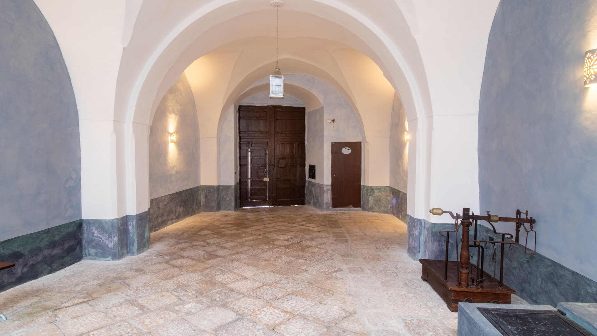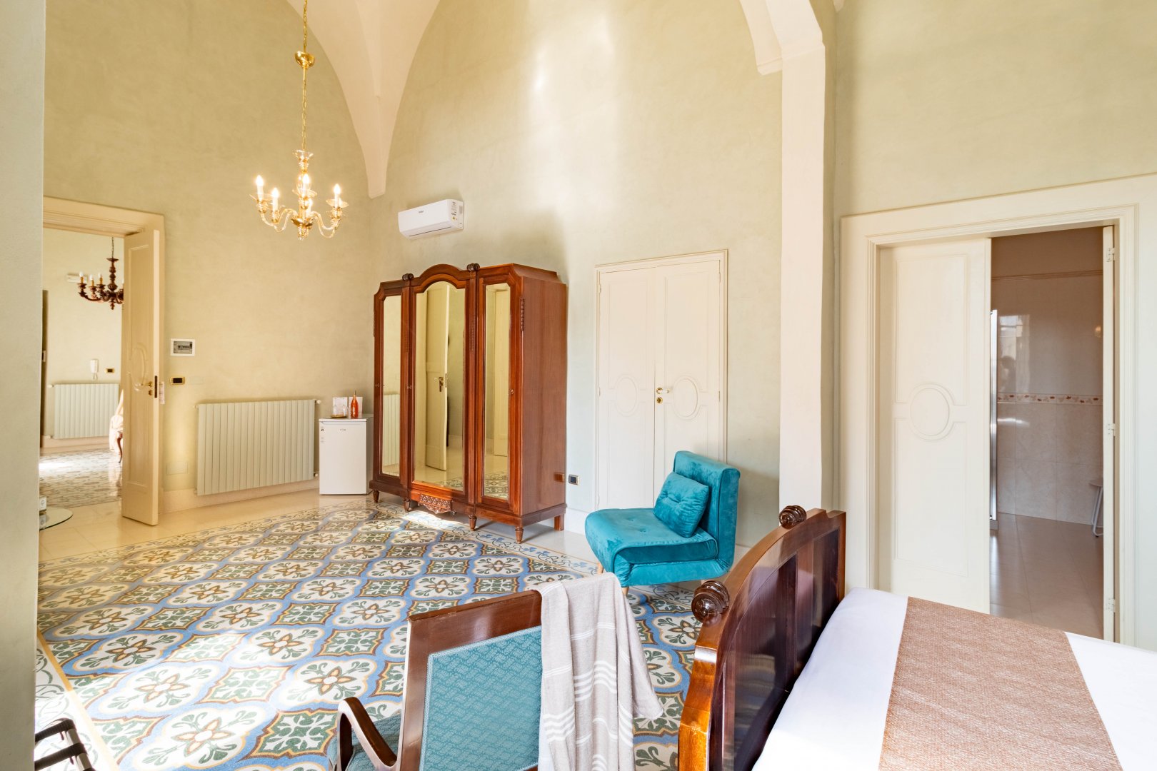 Completa di ogni comfort, TV e connessione Wi-Fi, la Suite si tinge di un verde tenue che culmina in un ricercato arco che apre allo spazio dedicato al riposo, quello in cui troneggia un letto matrimoniale d’epoca interamente in legno. Il bianco delle volte ritorna nei motivi geometrici e vagamente floreali del pavimento, che costituisce il principale elemento di decoro di un ambiente dall’eleganza essenziale e mai ridondante. I colori dominanti dell’azzurro, del verde e dell’ocra fanno riecheggiare la luce che entra dalle due alte finestre, entrambe aperte su un balconcino che affaccia sul meraviglioso e profumato giardino interno al Palazzo.