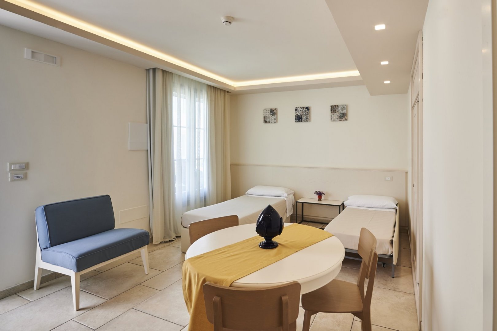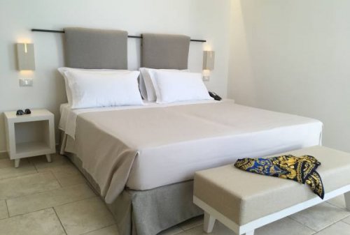 La struttura: composta da 123 camere ampie e luminose, dotate di ogni comfort: aria condizionata, telefono, TV, cassetta di sicurezza, frigobar. Le camere sono suddivise in: 92 Comfort da 2 a 5 posti letto (di cui 14 comunicanti e 6 con doppio bagno, uno dei due per Ospiti diversamente abili) con letto matrimoniale e divano letto fisso o a castello, 6 Suite 2+2 composte da ingresso con divano letto 2 posti (estraibile) e camera matrimoniale. Sono disponibili inoltre 25 camere Classic situate all’interno della antica masseria e sono suddivise in: 21 Classic Comfort da 2 a 5 posti letto con letto matrimoniale e divano letto fisso e a castello e 4 Classic Deluxe con letto matrimoniale e divano letto singolo.