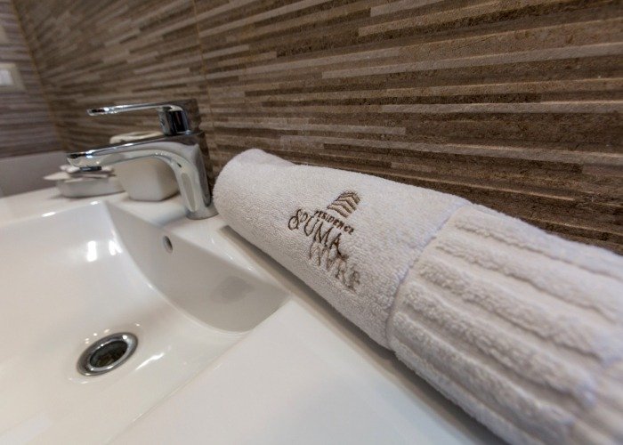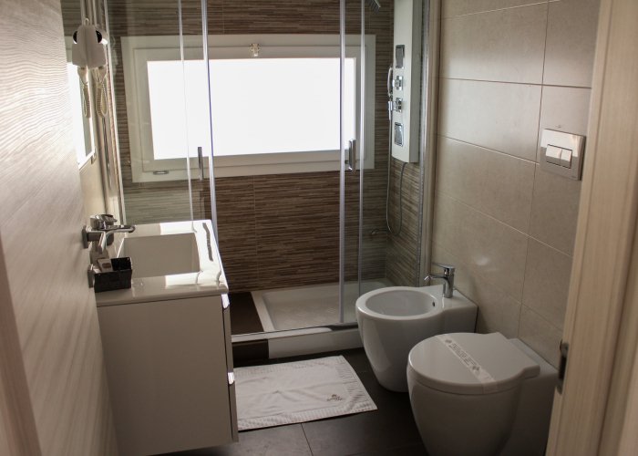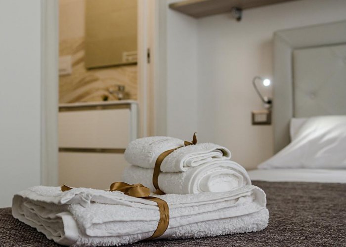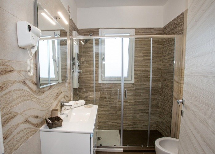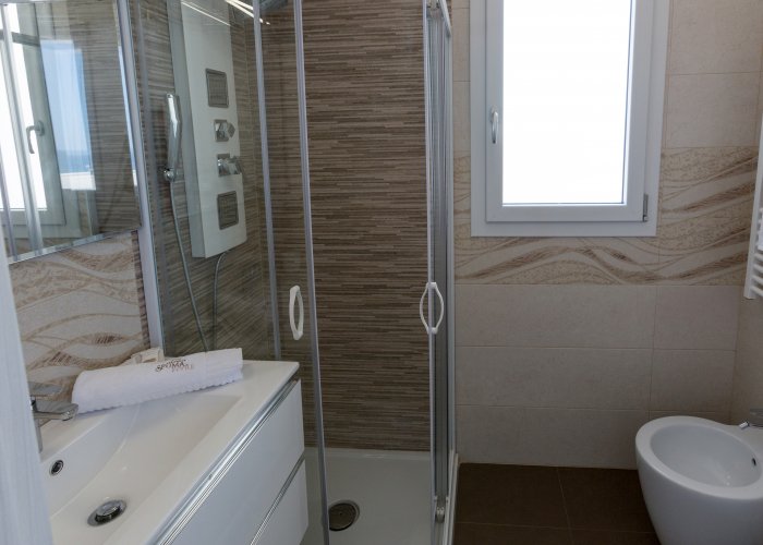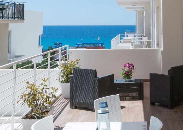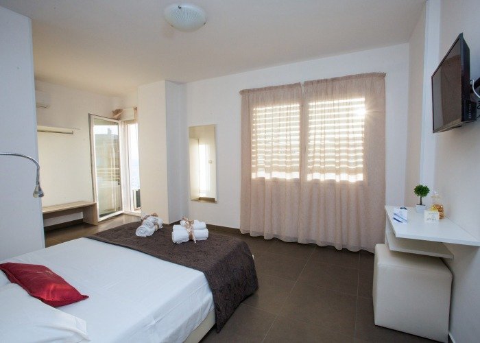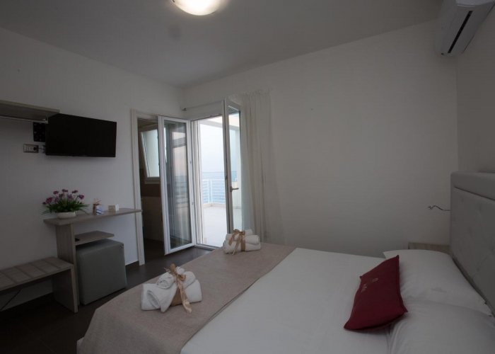 Camera Deluxe con terrazzo fronte mare, situata all’ultimo piano della nostra struttura. L’alloggio è composto da bagno, camera e terrazzo. La camera offre il solo pernottamento e comprende: riassetto a giorni alterni con cambio biancheria da bagno, Tv, Wi-fi in camera, frigo bar (vuoto), bagno completo con fornitura di sapone mani, schiuma doccia e capelli, phon.