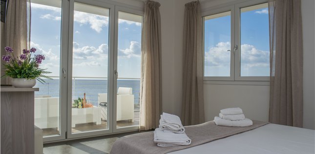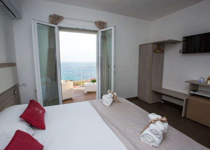 Camera Deluxe con Vista Mare, situata all’ultimo piano della nostra struttura. L’alloggio è composto da bagno, balcone di piccole dimensioni, vista mare. La camera offre il solo pernottamento e comprende: riassetto a giorni alterni con cambio biancheria da bagno, Tv, Wi-fi in camera, frigo bar (vuoto), bagno completo con fornitura di sapone mani, schiuma doccia e capelli, phon.