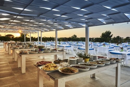 Ristorazione: 4 sale ristorante distinte, tutte con tavolo assegnato e 2 ristoranti alternativi: Sala Rubino con Garden Square all’esterno nella piazza, Sala Argento, Sala Diamante, Sala Avorio, “Il Pugliese” in terrazza con vista sul Resort, disponibile solo a cena su prenotazione, compreso nella quota di soggiorno (28 maggio/17 settembre), “Beach Restaurant” in spiaggia disponibile solo a pranzo, su prenotazione, compreso nella quota di soggiorno (28 maggio/17 settembre). All Inclusive (28 maggio/17 settembre): pensione completa a buffet con bevande incluse ai pasti e cucina mediterranea che prende spunti dalla ricca tradizione locale; serata pugliese con cena tipica pugliese, serata italiana e cena elegante; light breakfast presso il bar (9:30/11:30); Open Bar con consumo illimitato di bevande analcoliche alla spina, caffetteria, birra alla spina, alcolici e superalcolici nazionali, snack dolci e salati; passaggi di frutta e squisita pizza disponibile nel pomeriggio; sorpresa gastronomica notturna tre volte a settimana; aperitivi dello chef; tea time con piccola pasticceria; spumante italiano per tutti la sera dell’arrivederci. L'open bar non include: acqua minerale, bevande e birra in bottiglia e lattina, vino, liquori, alcolici e superalcolici esteri, gelati e prodotti confezionati. Nei periodi 02 aprile/27 maggio e 17 settembre/31 ottobre) si può scegliere tra la mezza pensione completa (riduzione €15,00 per persona al giorno) o all inclusive (servizio di facchinaggio, 2 percorsi benessere in SPA, WI-FI nelle zone comuni e in camera con access point, FBB con bevande incluse; bevande analcoliche, birra, alcolici e superalcolici nazionali, snack dolci e salati, caffetteria presso il Bar). Nei periodi di bassa stagione 02 aprile/27 maggio e 27 settembre/31 ottobre, a discrezione della Direzione, il servizio a buffet potrebbe essere sostituito dal servizio al tavolo con menu di tre portate. Speciale celiaci: si mettono a disposizione i prodotti base (pane, pasta e biscotti (Resort approvato AIC). Biberoneria(28 maggio/17 settembre): sala riservata con cucina attrezzata con scalda-biberon, sterilizzatore, una piastra a 4 fuochi, un forno a microonde, pentolini, un lavello, seggioloni, tavoli e sedie per i piccini (disponibili su richiesta anche in sala). Fornisce: brodo vegetale senza sale, passato di verdure, crema di riso, salsa di pomodoro senza sale, latte intero o parzialmente scremato, formaggini, formaggio grattugiato, yogurt e 2 tipi di pastina per bambini. Presenza di personale per assistere le mamme durante le ore dei pasti.
