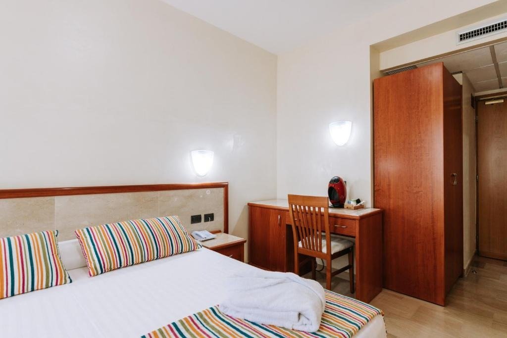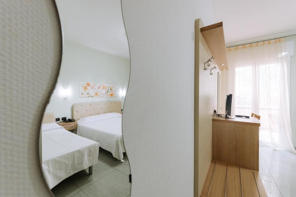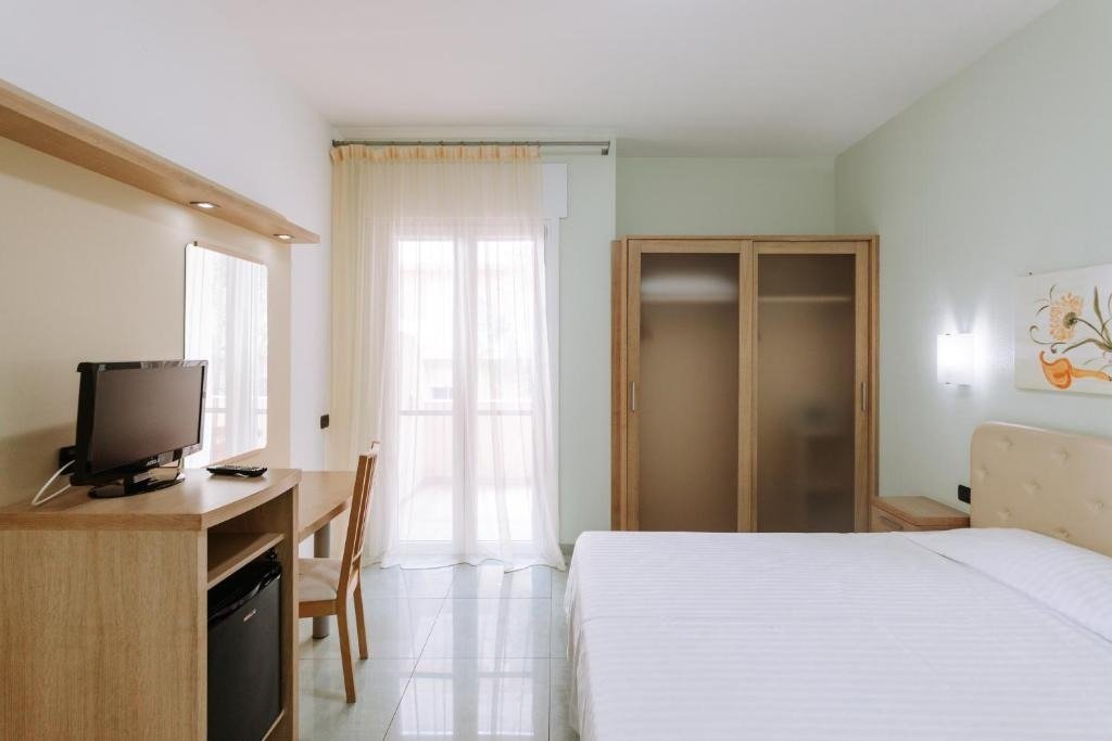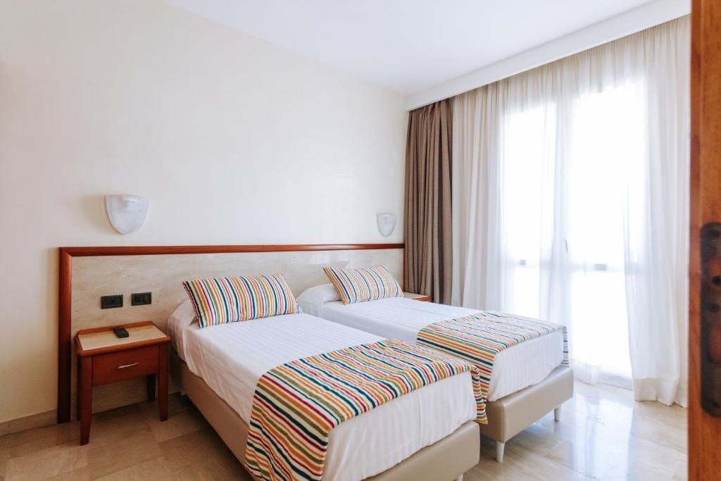 Le 135 camere dell Hotel, disposte su più piani, tutte dotate di balcone attrezzato, aria condizionata, TV LCD, minibar (consumazioni a pagamento, fornitura gratuita di 2 bottigliette di acqua all'arrivo), cassetta di sicurezza, telefono, servizi con doccia e asciugacapelli. Si suddividono in: Classic, fino a 4 posti letto con 3° e 4° singolo, possibilità di camere vista piscina ( con supplemento); Comfort, fino a 3 posti letto, dotate di arredi di categoria superiore e più ampie; Deluxe, dotate di doppia ambiente e composte da camera matrimoniale e camera doppia, ideali per nuclei familiari o gruppi di amici. Gli ospiti delle camere Deluxe avranno diritto alla couverture seral, set linea cortesia top, accappatoio e ciabattine, macchina per espresso con dotazione di cialde, prima fornitura analcolica minibar, fornitura giornaliera di 2 bottigliette di acqua, telo mare con cambio giornaliero e posto auto riservato nella zona ombreggiata. La struttura è priva di barriere architettoniche e dispone di camera matrimoniale, camera per persone con disabilità.