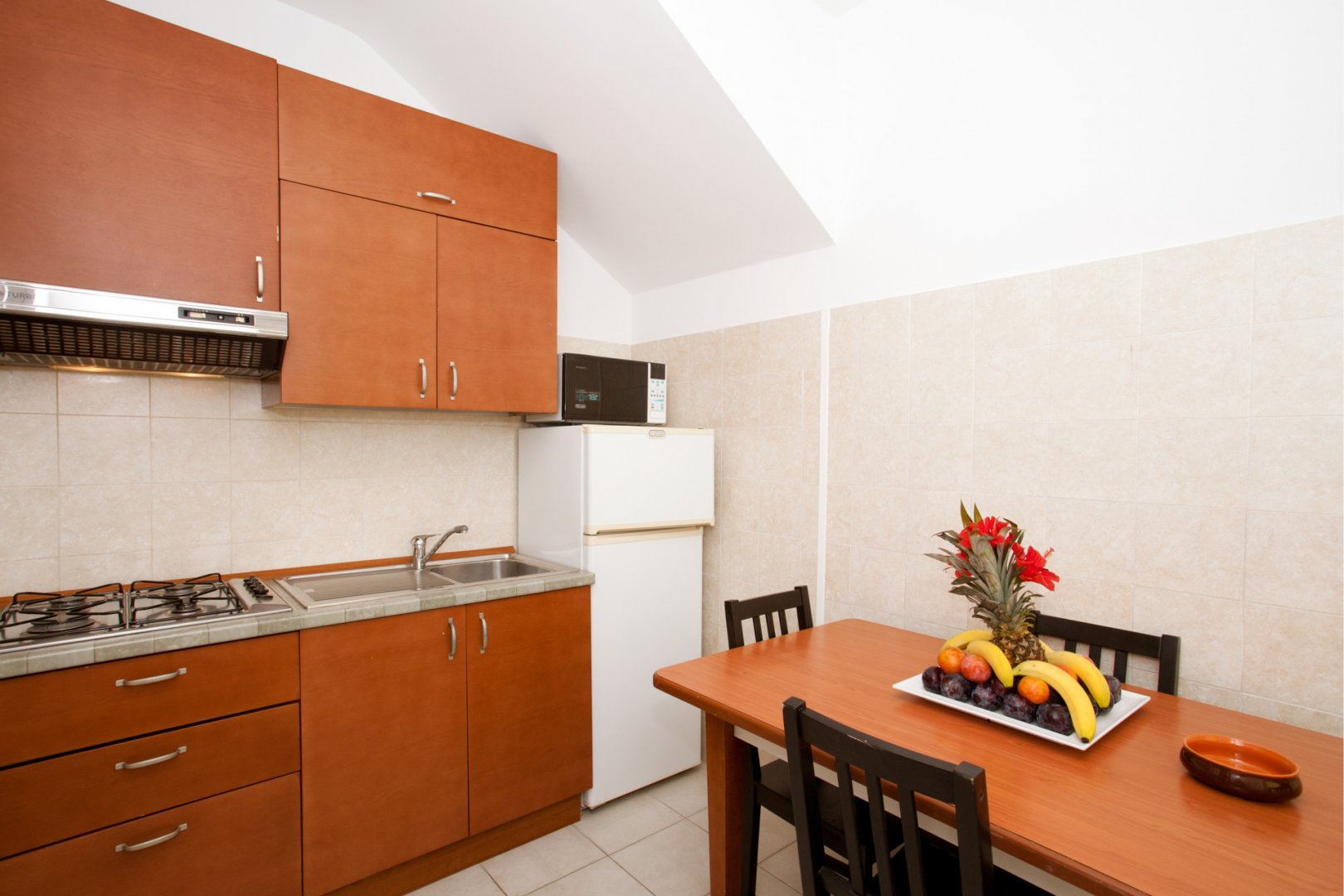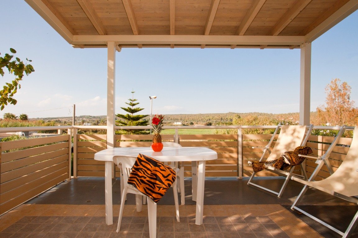 I trilocali 5 posti letto, al primo piano, dotati di balconcino anteriore e ampio balcone posteriore attrezzato con tavolo e sedie. Composti da camera da letto matrimoniale, camera con letto a castello ( struttura fissa) e armadio, bagno con box doccia, soggiorno con 5° posto letto, tavolo e sedie e angolo cottura attrezzato con pentole e stoviglie. Doccia esterna situata al piano terra vicino alla scalinata di accesso. Tutti gli appartamenti dispongono di: climatizzatore, tv, telefono, cassaforte elettronica, zanzariere, posto auto. Leggi tutto »